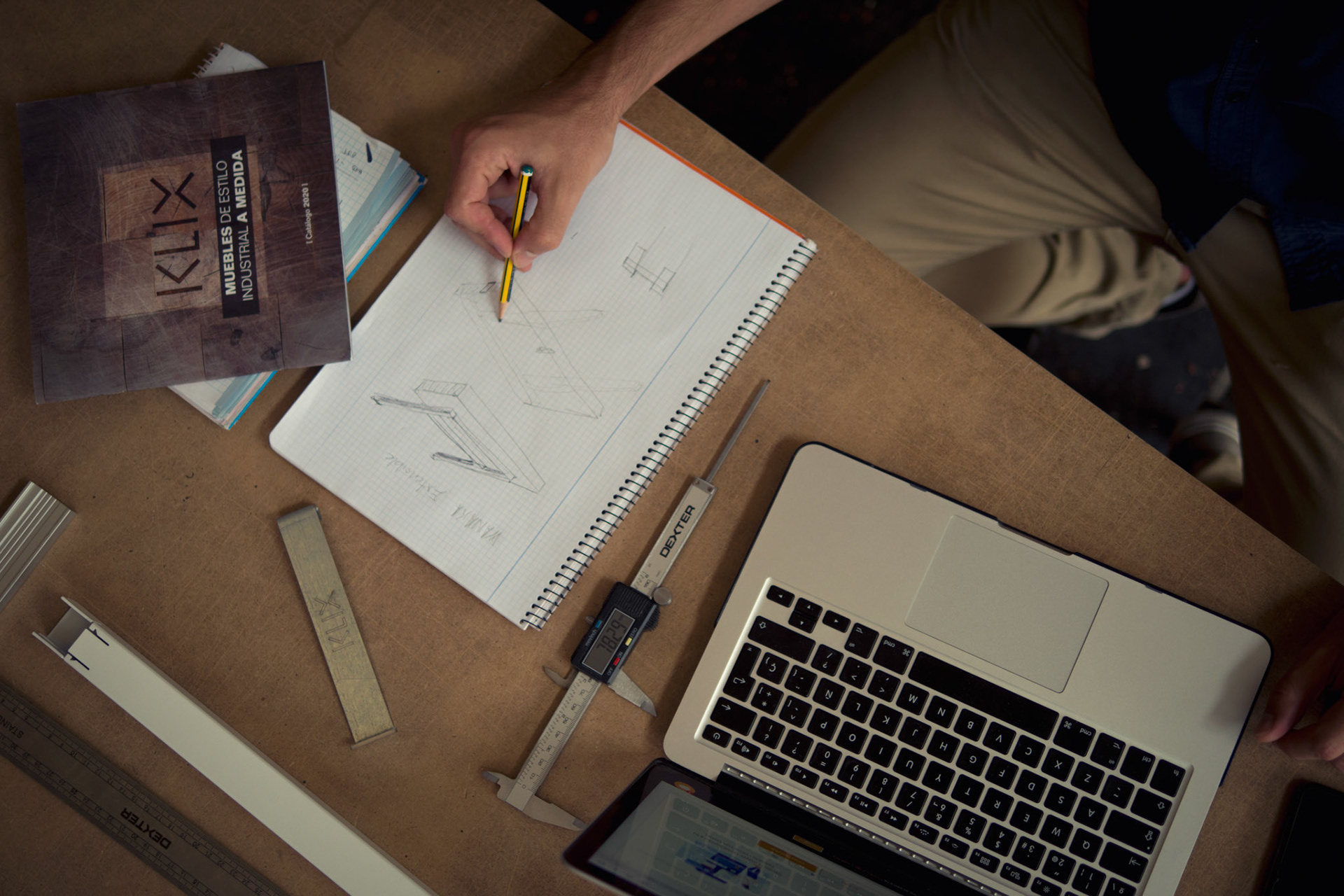 Página web www.klix.es, fotografías y diseño de piezas promocionales para Klix muebles de estilo industrial a medida.