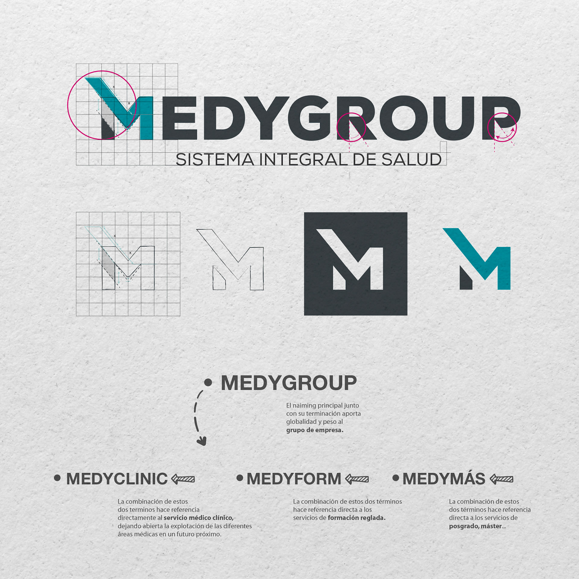 Naming, diseño y desarrollo de arquitectura de marca para el Grupo Medygroup, para sistemas integrales de salud.